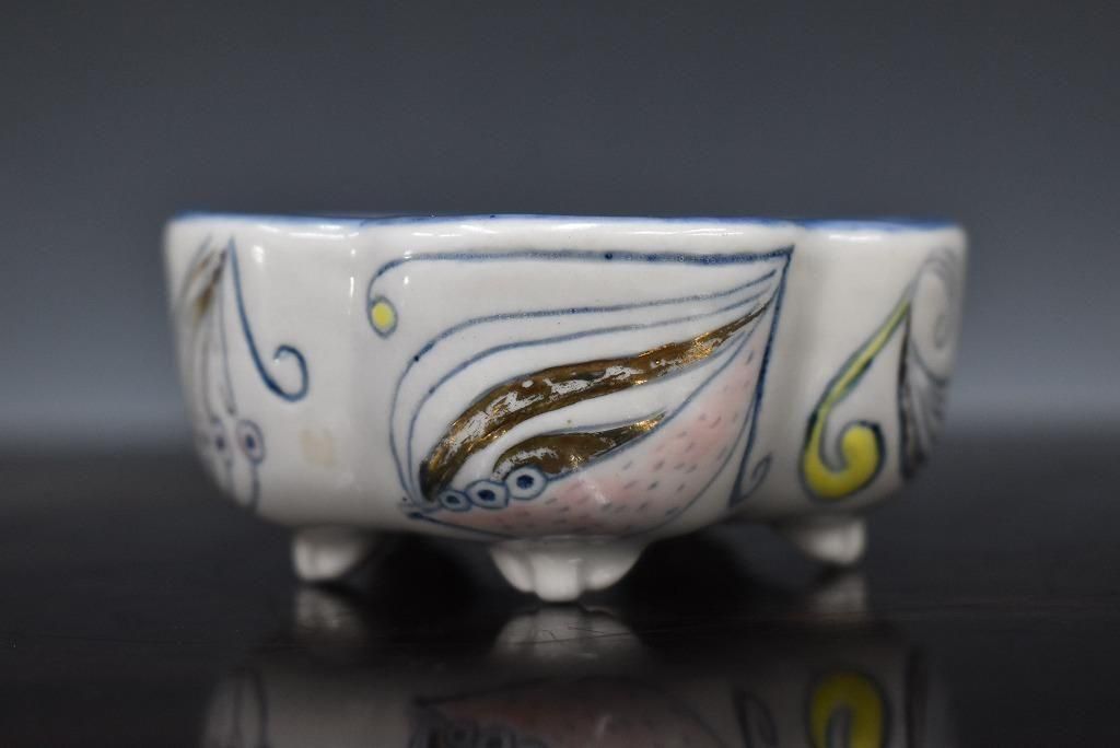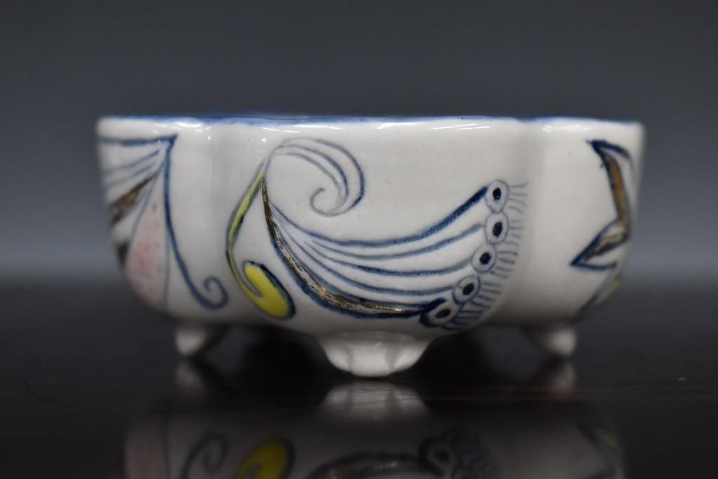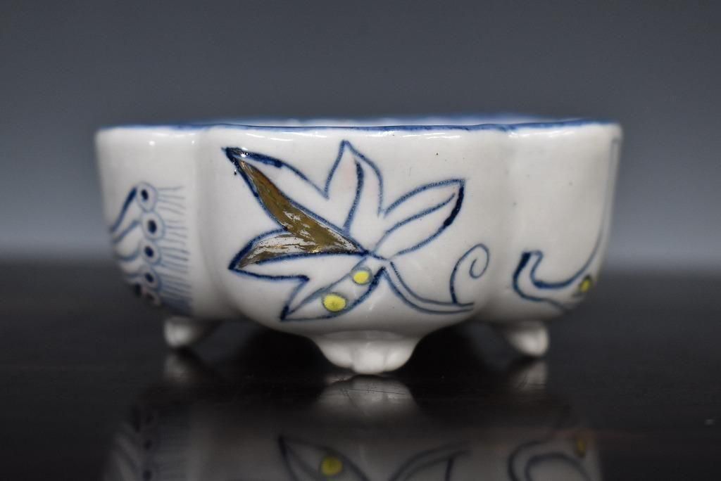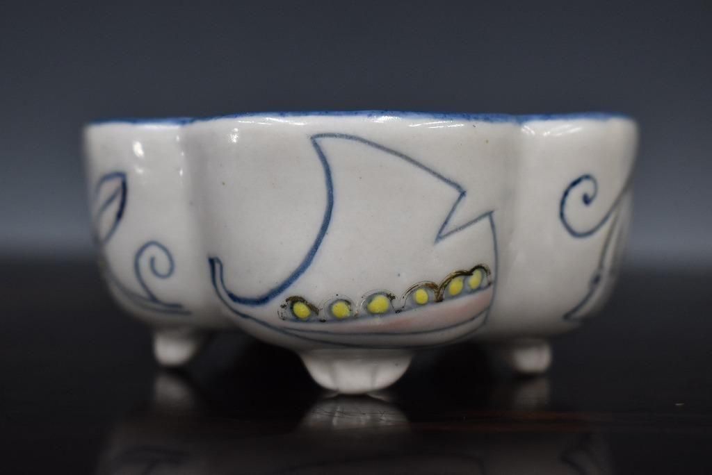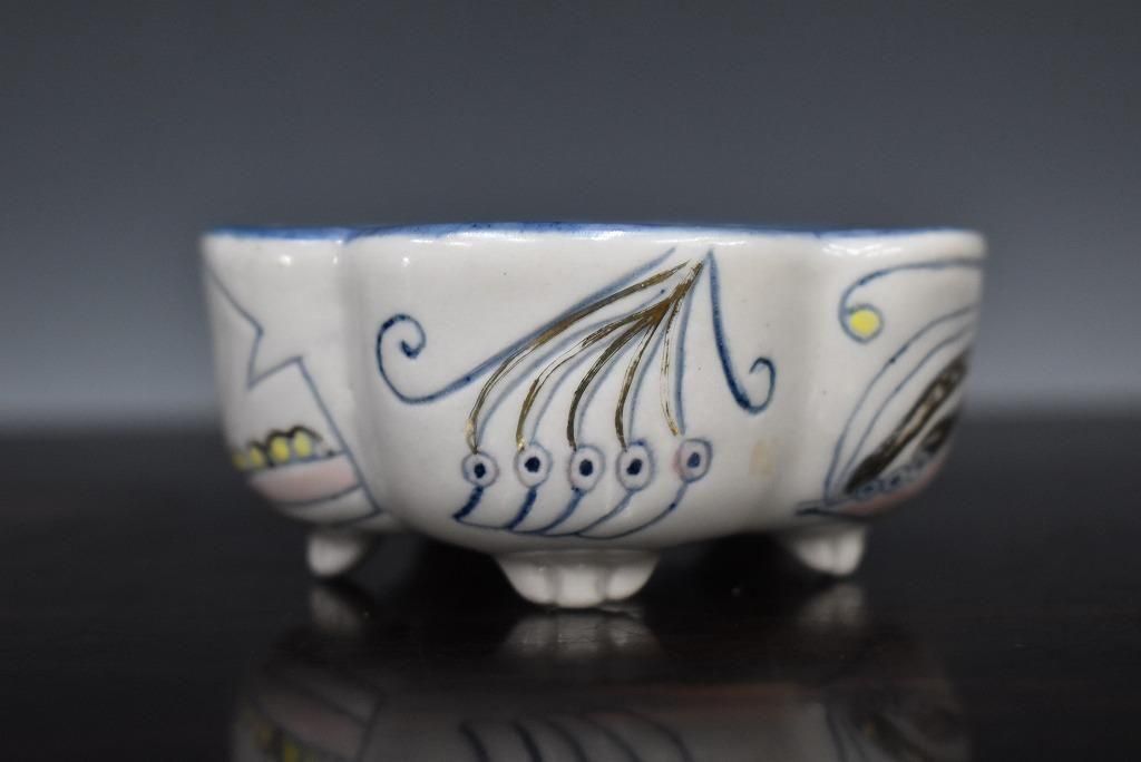 なかなかシュールな模様。釉も良く草やミニ盆栽で使いたい。