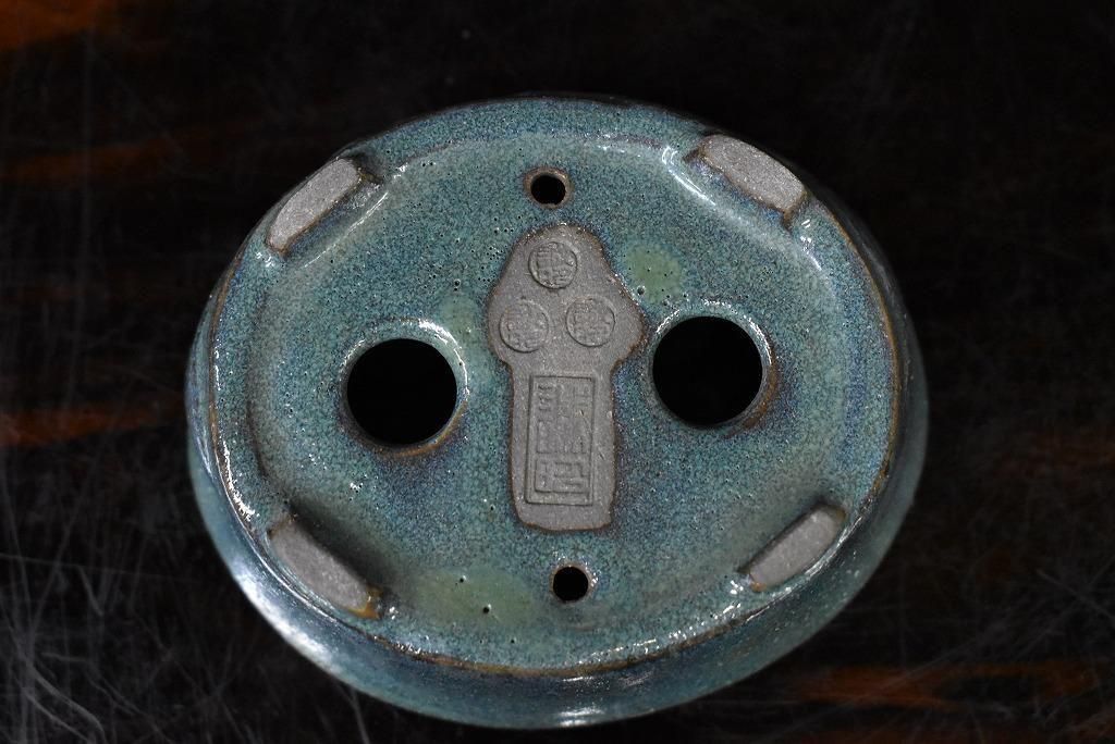 誠昭03 花図浮彫碧釉楕円