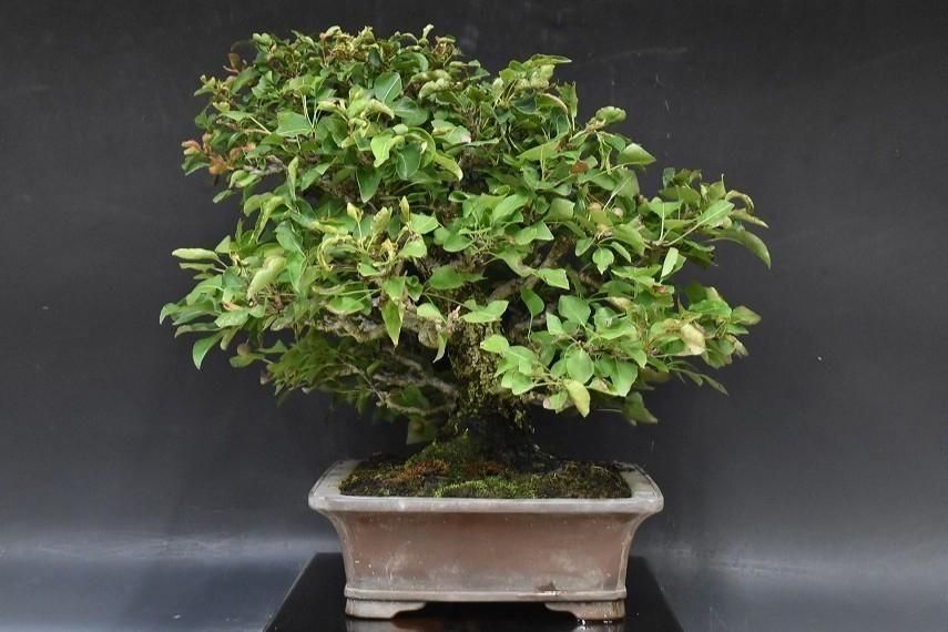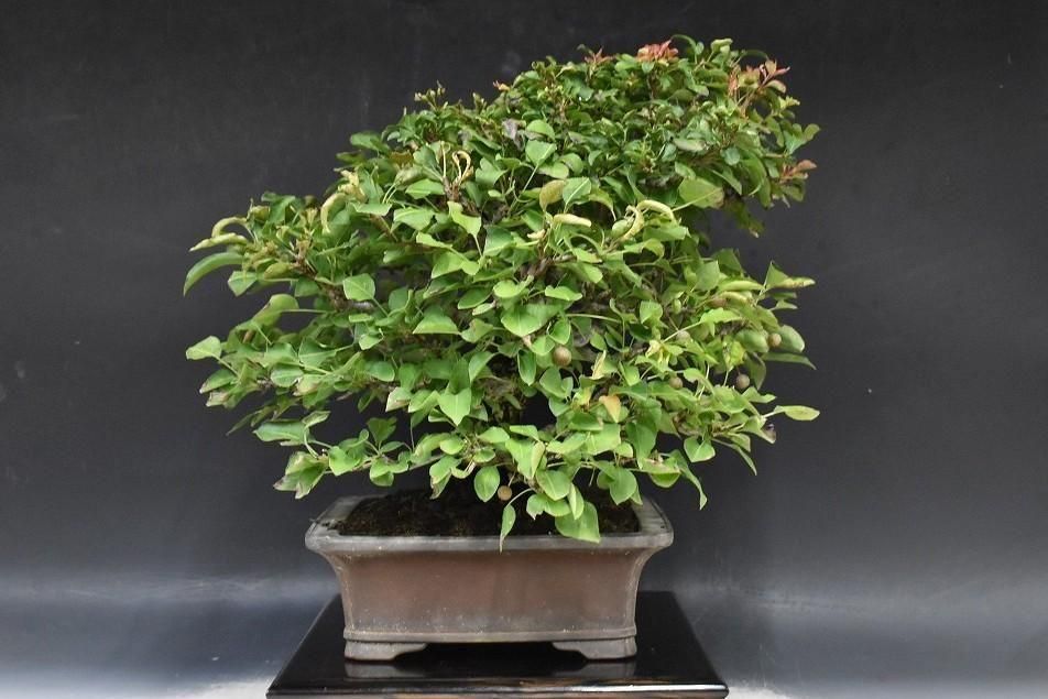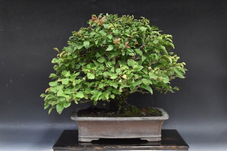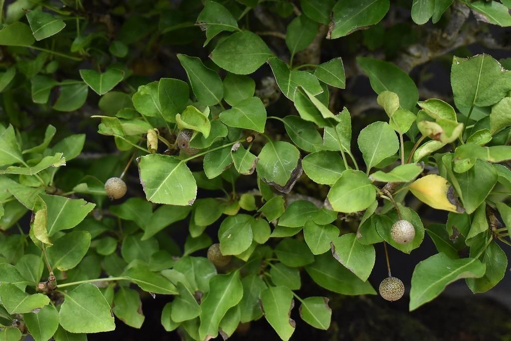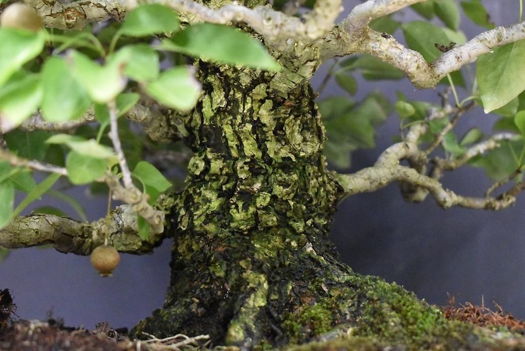 鉢の中で古い樹。肌もきているし、実も付いている。もともとは小品盆栽だった樹。